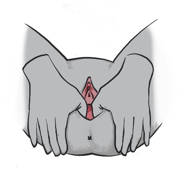 - With clean hands, hold your thumbs in the position shown for about 1 minute (diagram below). Press down towards the anus and to the sides of the vagina walls. Hold your thumbs in this position for about 1 minute. You will begin to feel a stretching sensation. Breathe deeply