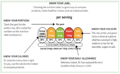 Traffic light coded labels on food packaging can highlight if a food is high (red), medium (amber) or low (green) in calories, fat, saturated fat, sugar and salt. This can help you to make healthier choices, by choosing foods with more green and amber and having those with reds less often or in small amounts.