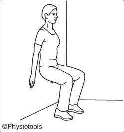 - Stand with your back against the wall, with feet hip width apart and away from the wall. Slowly slide down the wall as far as you are comfortable. Then slowly push back up again. Perform 3 sets of 10 repetitions.