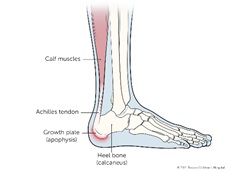 It is linked to the Achilles tendon being tight, which causes it to pull on the growth plate (apophysis). When the muscles and tendons pull at the growth plate, the repeated motion can cause inflammation and swelling in this region, resulting in pain at the back of the heel. Muscles or tendons can become tight during a growth spurt, as bones grow faster than muscles.