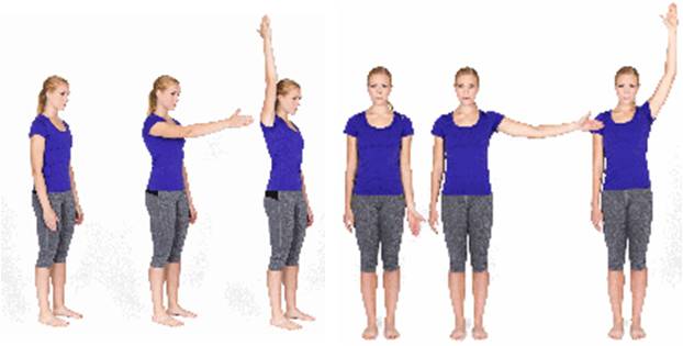 Start with your arm straight and reach forwards and up then return to the starting position. Then reach out to the side and up.