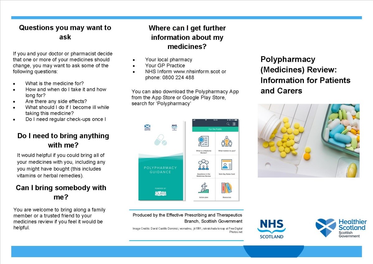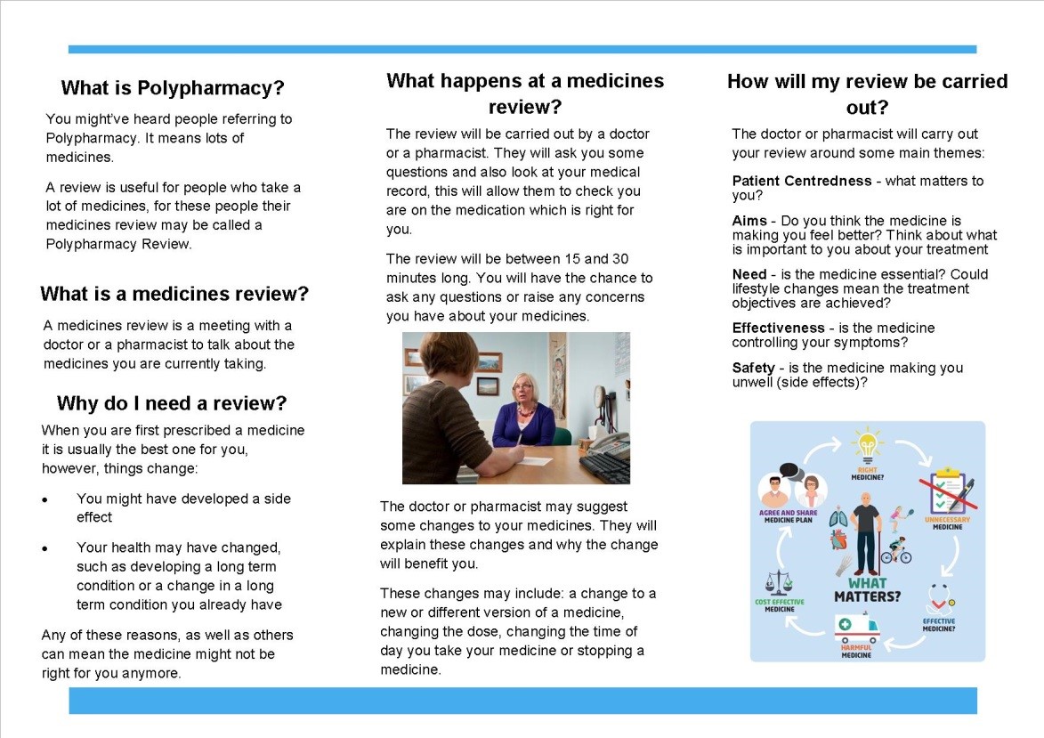 Visiting the GP practice can be daunting for a patient, especially when they are unsure of what to expect. The leaflet below has been produced to help patients understand what happens during a polypharmacy review, why they need a review and it also highlights to patients that they can also use the review as an opportunity to ask any questions or share any concerns they have about their medicines. This leaflet was designed in partnership with a patient focus group.