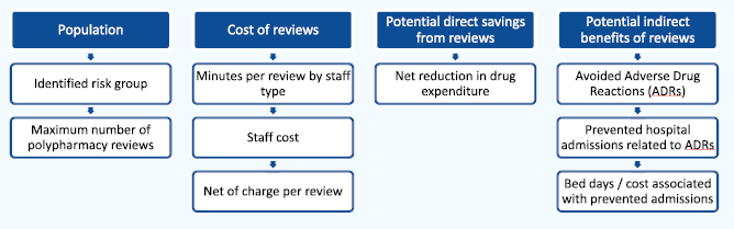The goal of the SIMPATHY Economic Analysis tool 66, developed as part of the EC SIMPATHY project, was to provide a high-level analysis of the economic costs and benefits associated with carrying out polypharmacy reviews. The analysis follows a top-down approach and estimates maximum costs and benefits associated with activity. Activity is driven by the selected population for whom reviews are intended to be carried out.