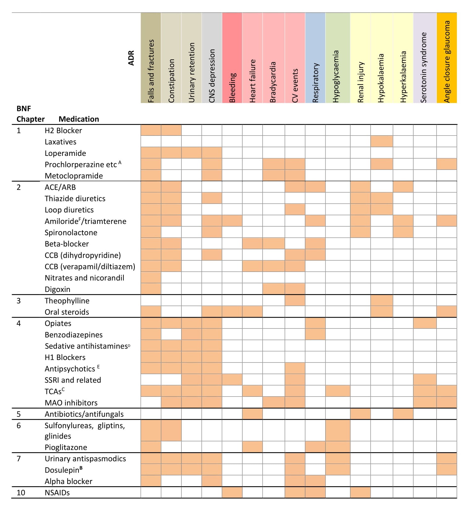 The chart below cross-tabulates medication and Adverse Drug Reaction (ADR) risks associated with them.It can help identify actual ADRs and the risk of developing them. It identifies where an ADR may be due to a cumulative effect. Generally, the shaded areas represent side effects which are listed in SPCs as having an incidence greater than 1 in 10,000 (where the incidence is listed), or from knowledge of the mode of action of a medicine.