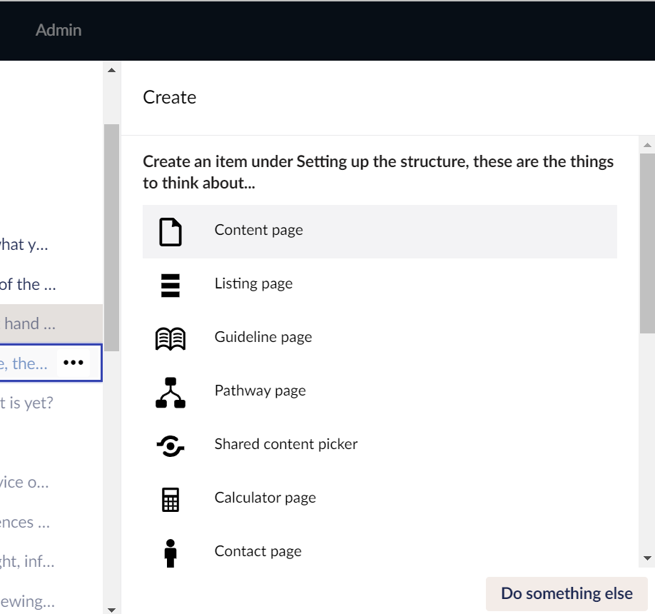 Using the left hand button of the mouse to click the ... symbol next to a given toolkit or section heading will produce a list of page types which can be created below the selected item. More information on these page types is provided in the following section, under the heading "Adding toolkit pages".