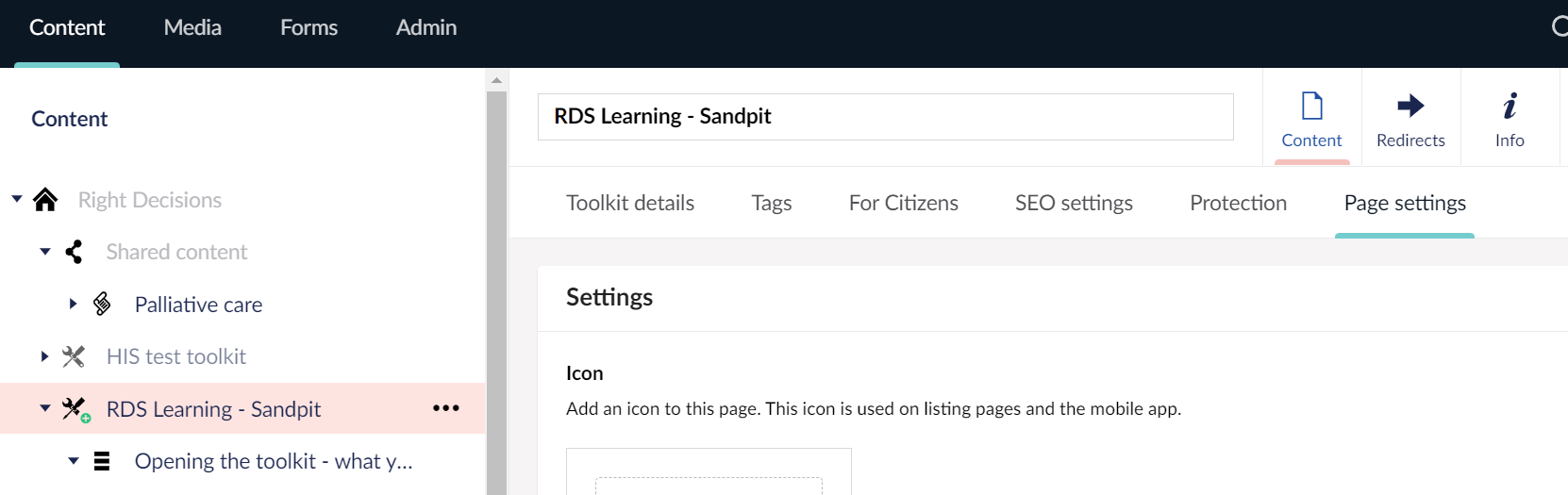 - Forms is rarely used and can be ignored. It relates to forms created in the Umbraco system, whereas we generally use Microsoft Forms or other software to embed forms in the RDS.