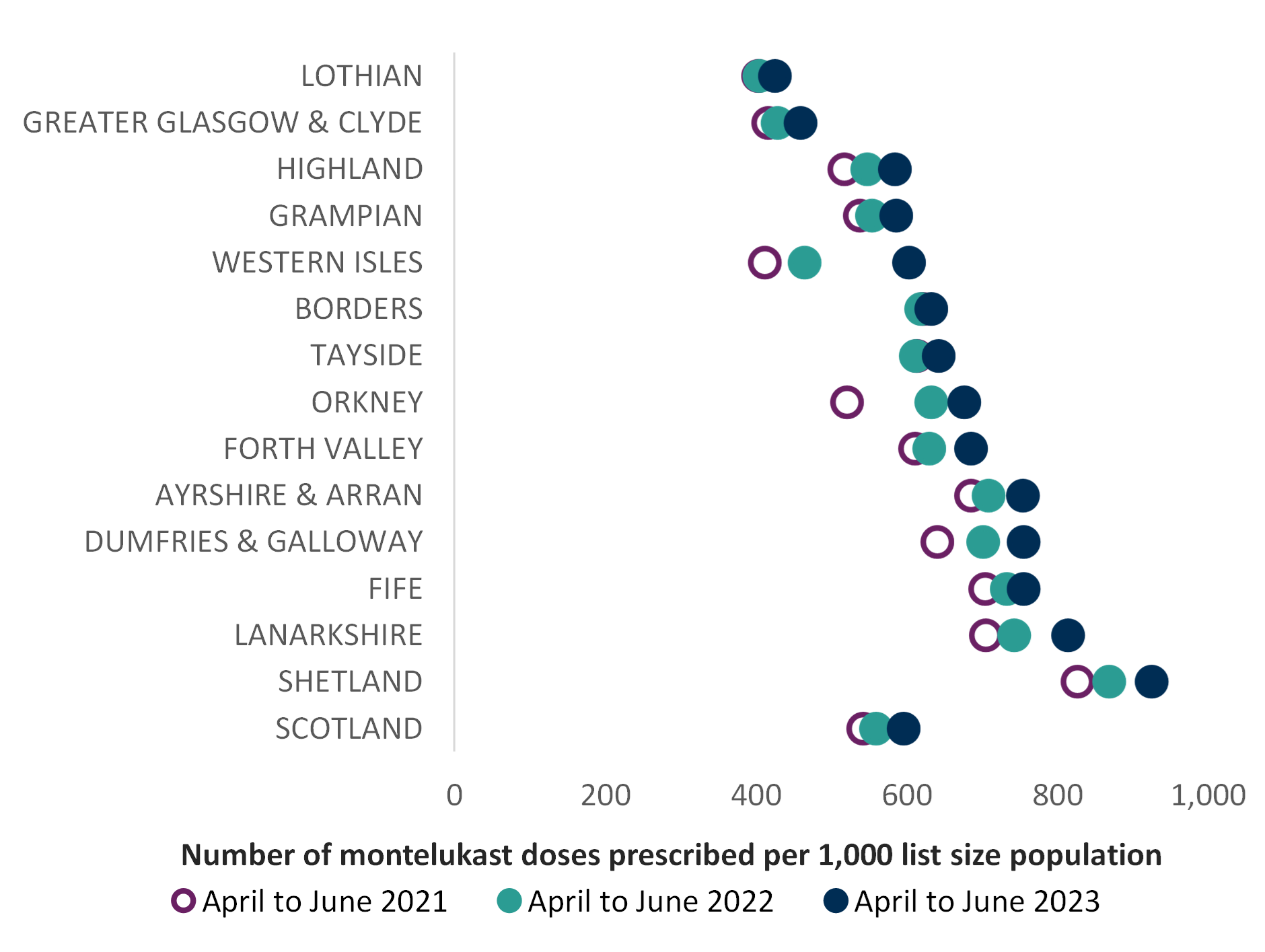 Number of montelukast doses prescribed per 1000 list size of population