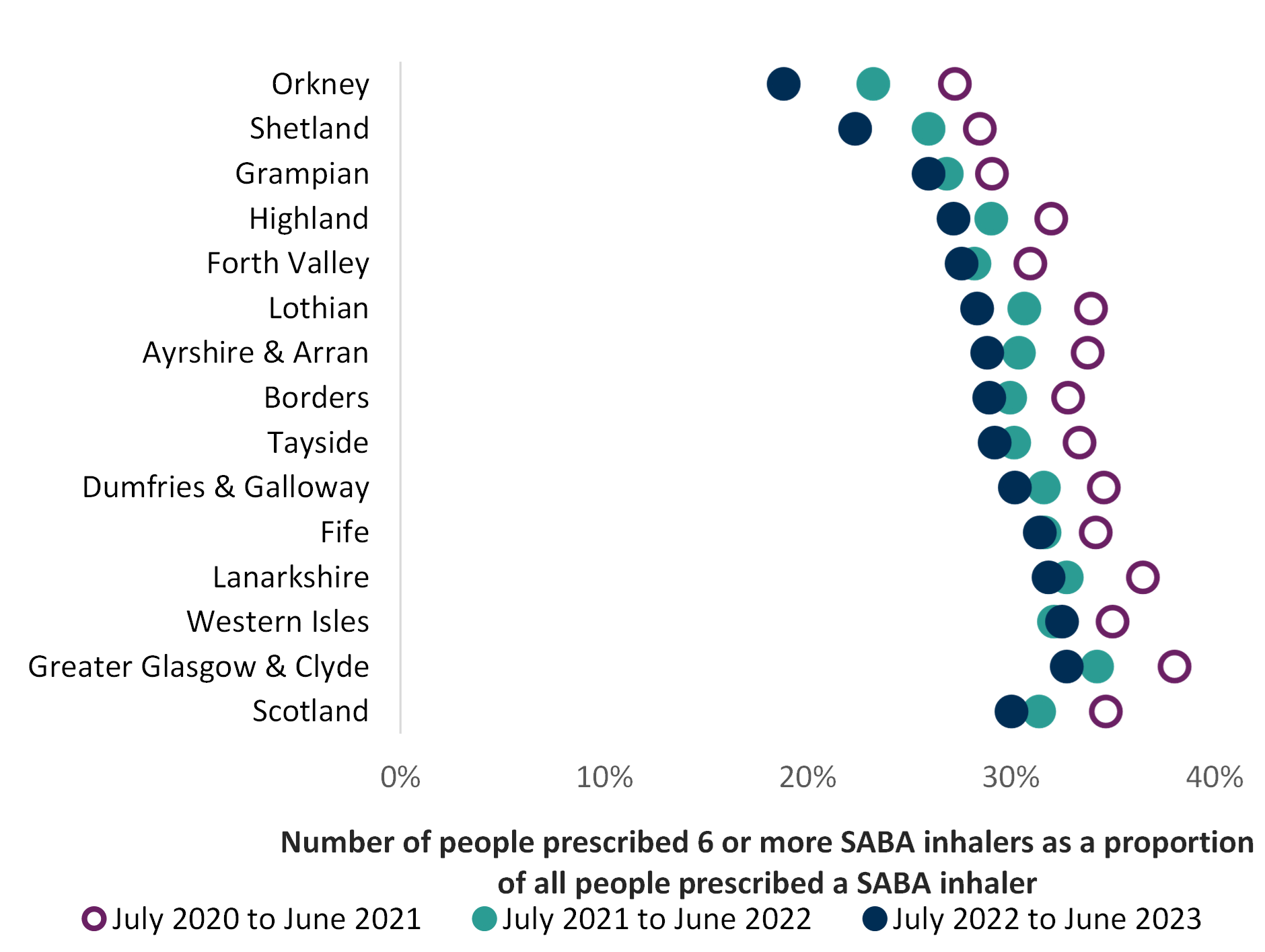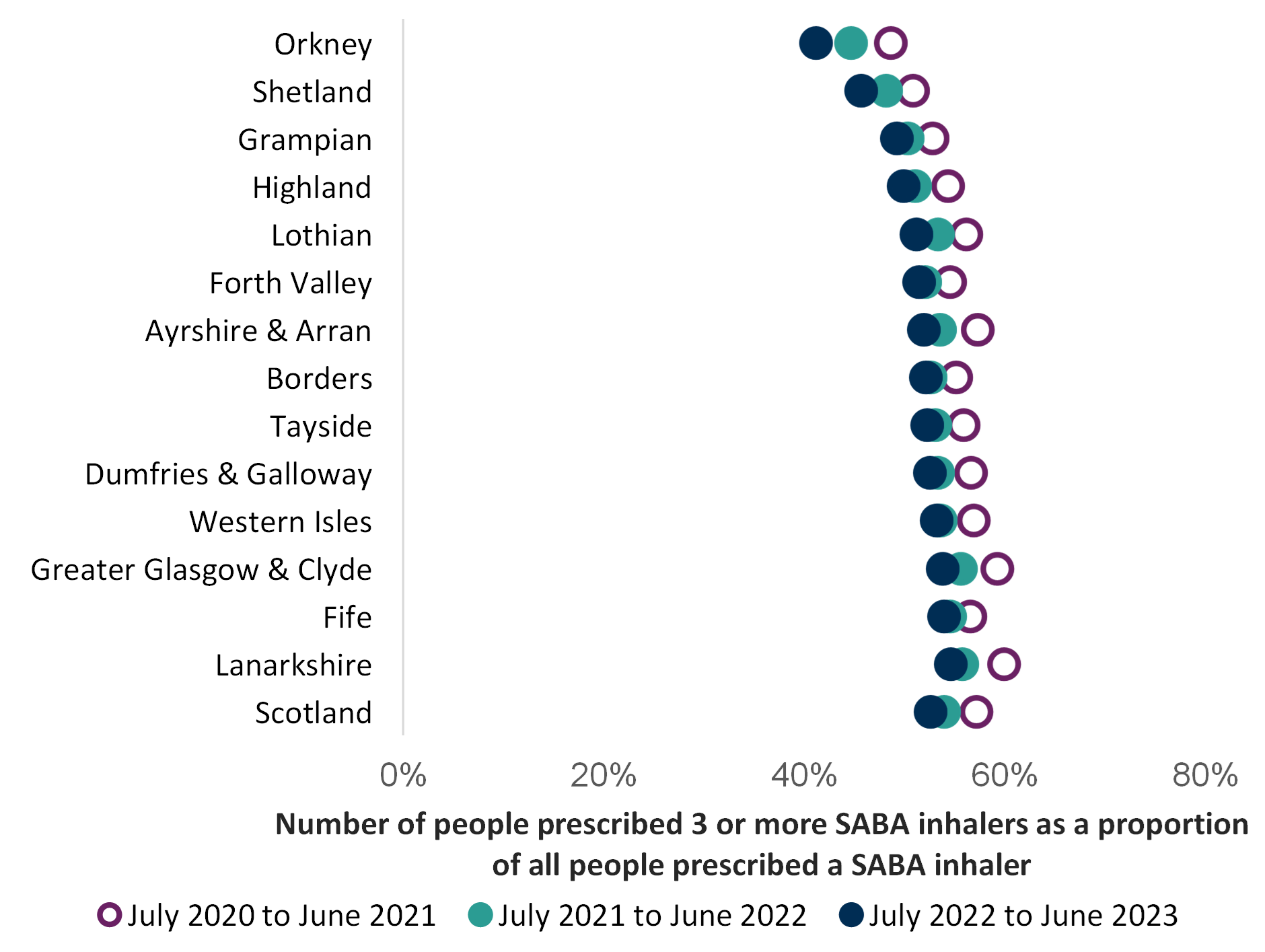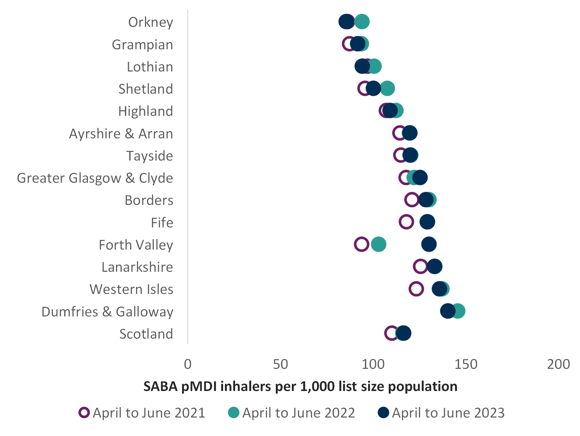 This guide includes an indicator chart of people prescribed three or more SABA inhalers as an aspirational level, as a person with well-controlled asthma would need no more than this (see Chart 2). This should be discussed at their annual routine review. This indicator is a guide and is unable to distinguish between people with asthma and COPD.