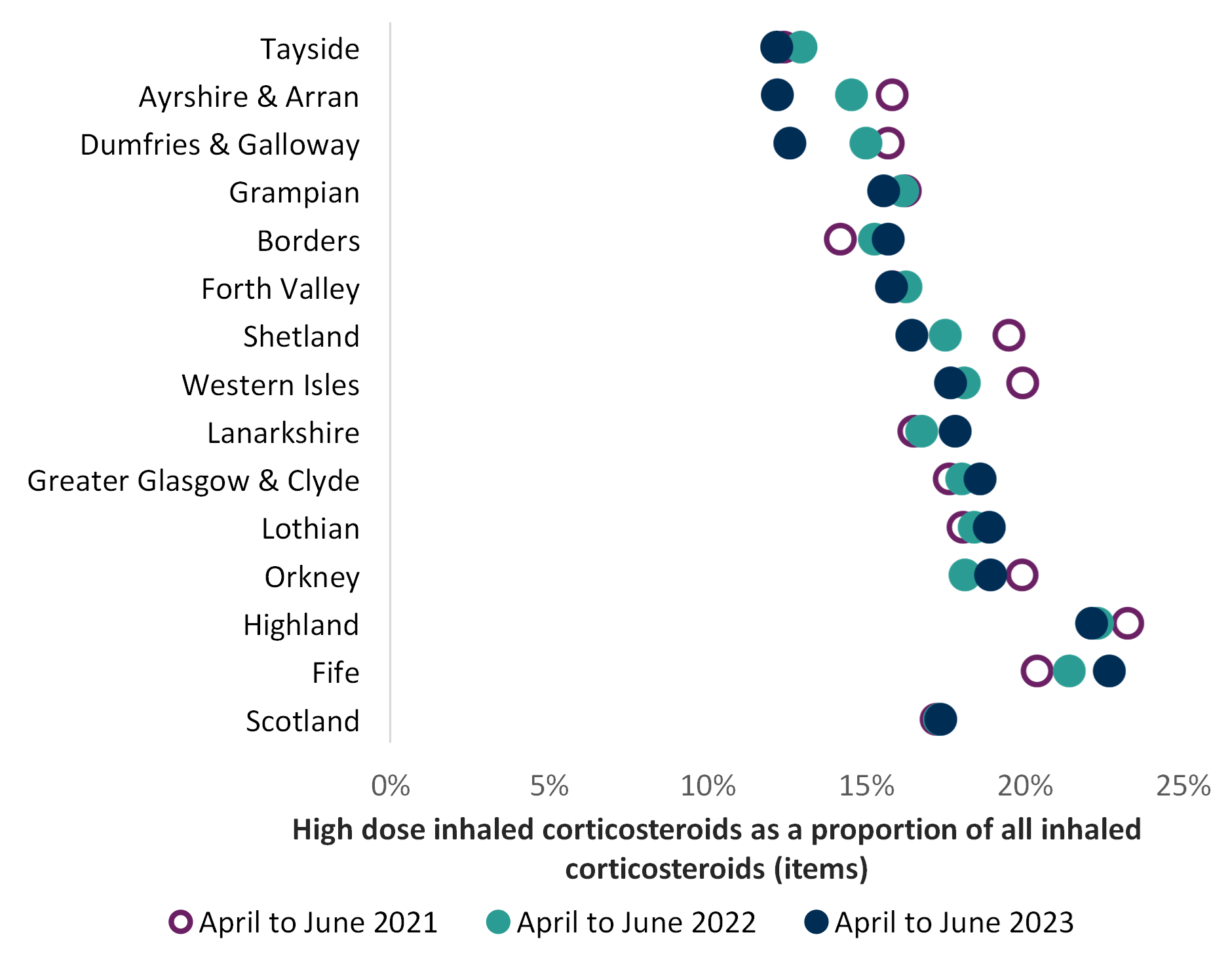 Note: High dose ICS prescribing used in the data corresponds to the definition of high dose steroids (both for adults and children) as per Table 12 in SIGN 158.6