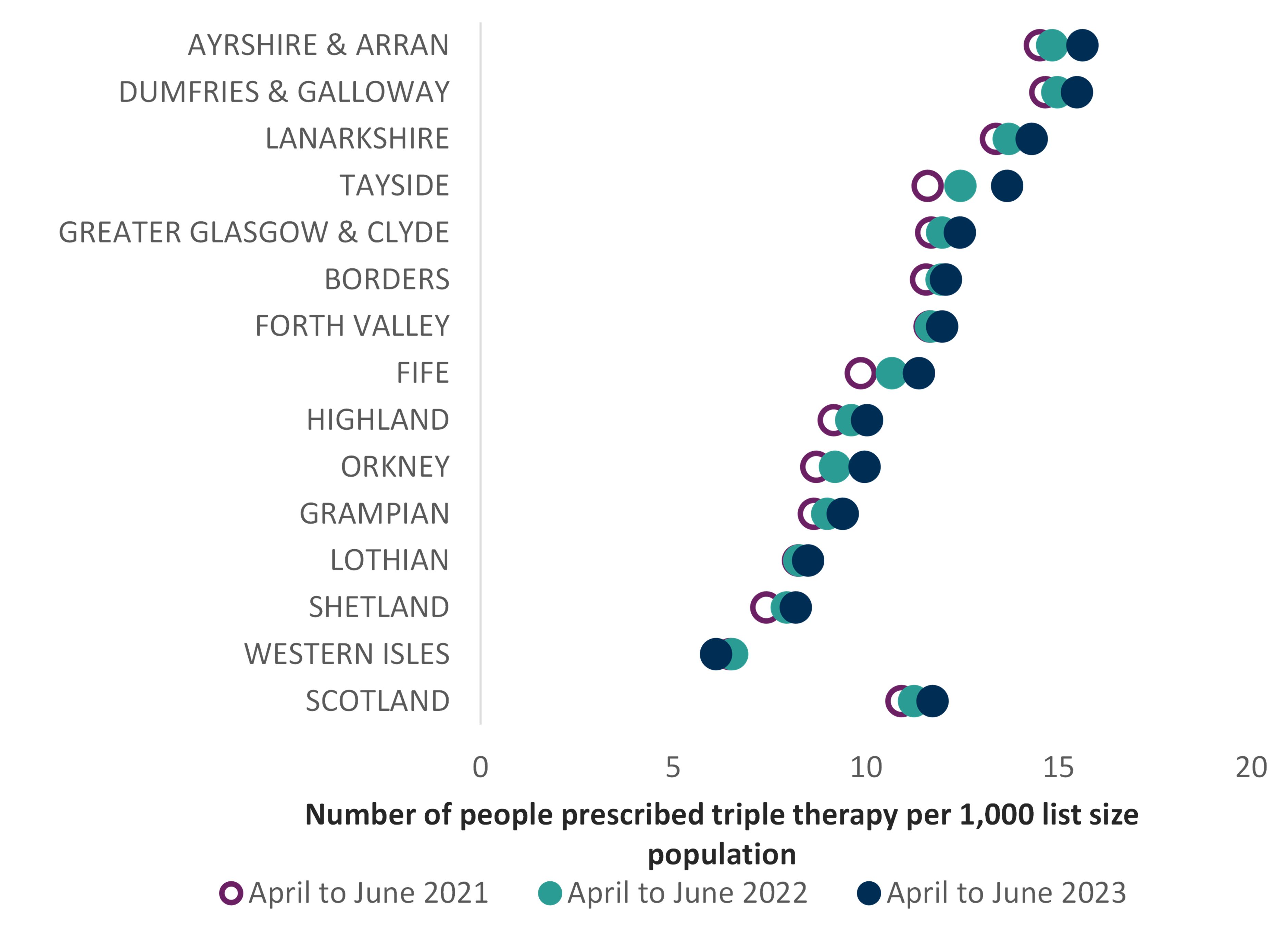 The chart below illustrates the use of triple therapy prescribing, as either separate inhalers or as a single triple inhaler, showing wide variation between NHS Boards, ranging from 15.63 in Ayrshire & Arran to 6.13 in the Western Isles. This may vary with prevalence of COPD within board regions.