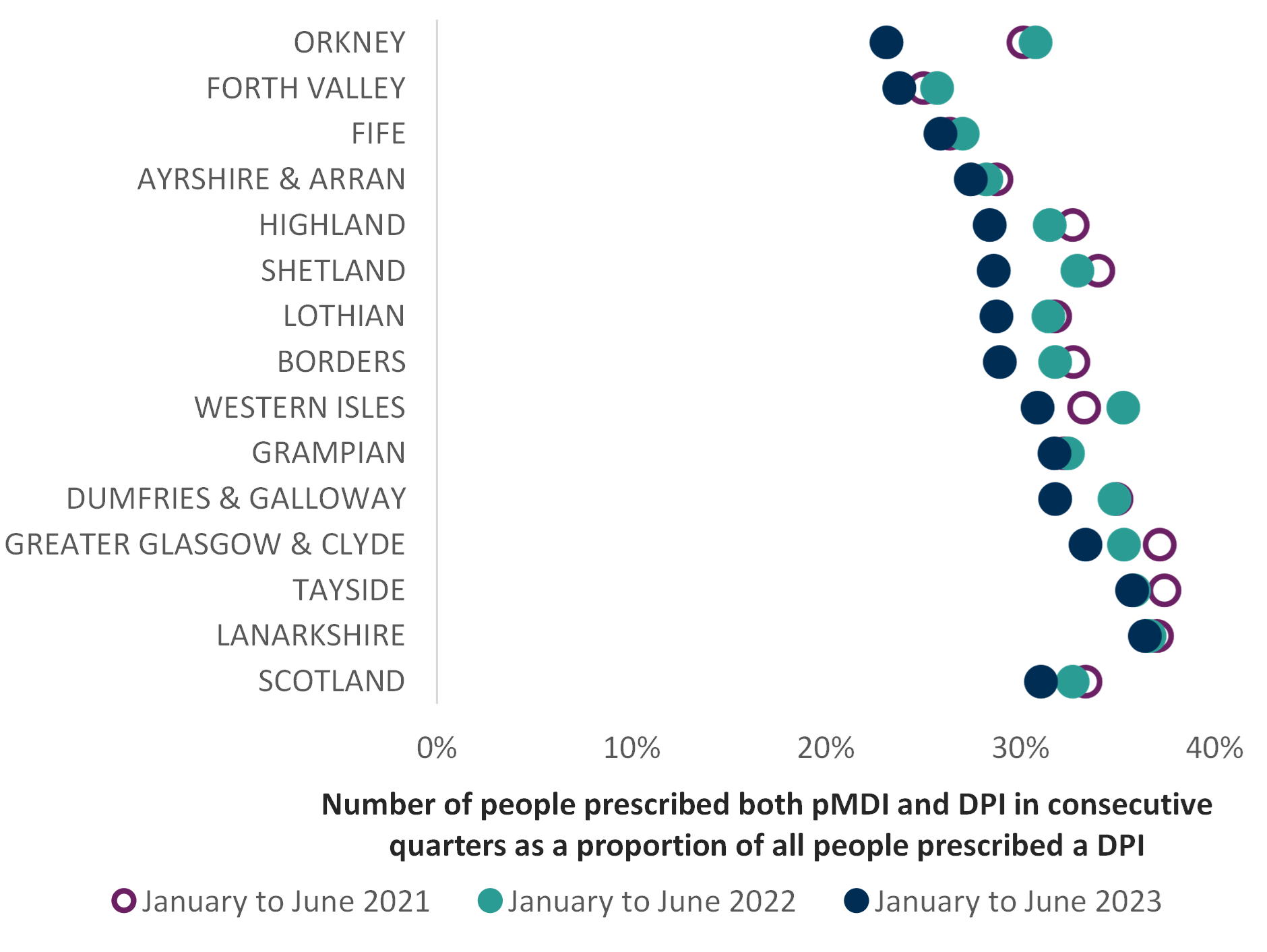 People prescribed both pMDI and DPI in consecutive quarters as a proportion of all people prescribed a DPI