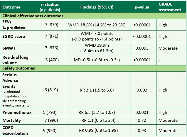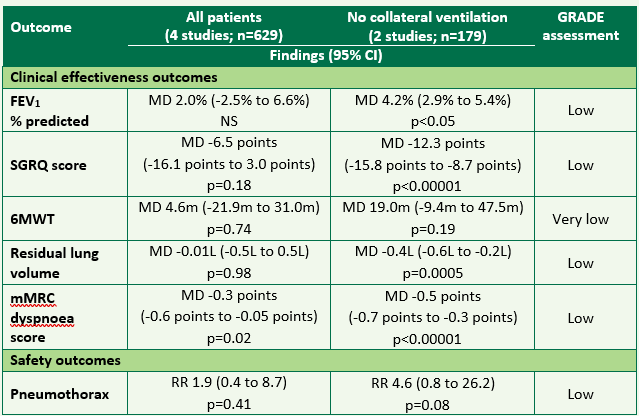 - A meta-analysis of four RCTs compared the Spiration® valve plus medical therapy with medical therapy alone or a sham procedure plus medical therapy in patients with severe or very severe emphysema. A sub-group analysis assessed the effects of the Spiration® valve in patients with little or no collateral ventilation. Results from the meta-analyses are summarised in table B. All statistically significant results (effectiveness and safety) favoured the intervention group.