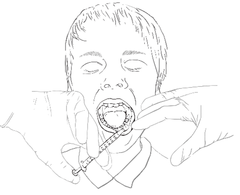 What form(s) of this medicine are there and how is it usually taken?The medicine is supplied in a syringe. The instructions below can help the person giving you the medicine. · Remove the syringe from its outer cover and throw away the cap at the end of the syringe. · Follow the dosing instructions that are on the dispensing label. · Using their finger and thumb, they will gently pinch and pull back your cheek. · With your head turned either to the right or left, they will place the tip of the syringe into the back of the space between the inside of your cheek and the lower gum (buccal cavity) and slowly push the plunger down until the syringe is empty.