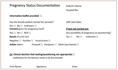 There are two possible options for ascertaining pregnancy status in female patients – consented pregnancy testing or direct enquiry. The testing should be considered as first line approach. In cases when this is not possible, practical or feasible, enquiry based assessment should be performed and documented.