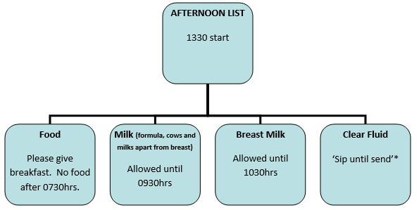 Families and staff should be given accurate and consistent information relating to fasting.  Written guidance should be given to patients and parents when they attend pre-assessment clinic, and/or when their booking letter is sent out.  The importance of providing food up until the fasting time (where practical) and clear fluids containing sugar until sending must be clearly explained to parents & guardians.