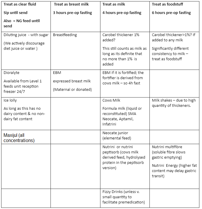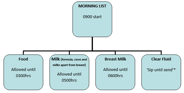 *Fasting guidance for patients undergoing emergency surgery should be decided by the anaesthetist on-call for Theatre 6. Their suitability for this guidance will depend upon their surgical and clinical condition. The on-call anaesthetist can be contacted on: