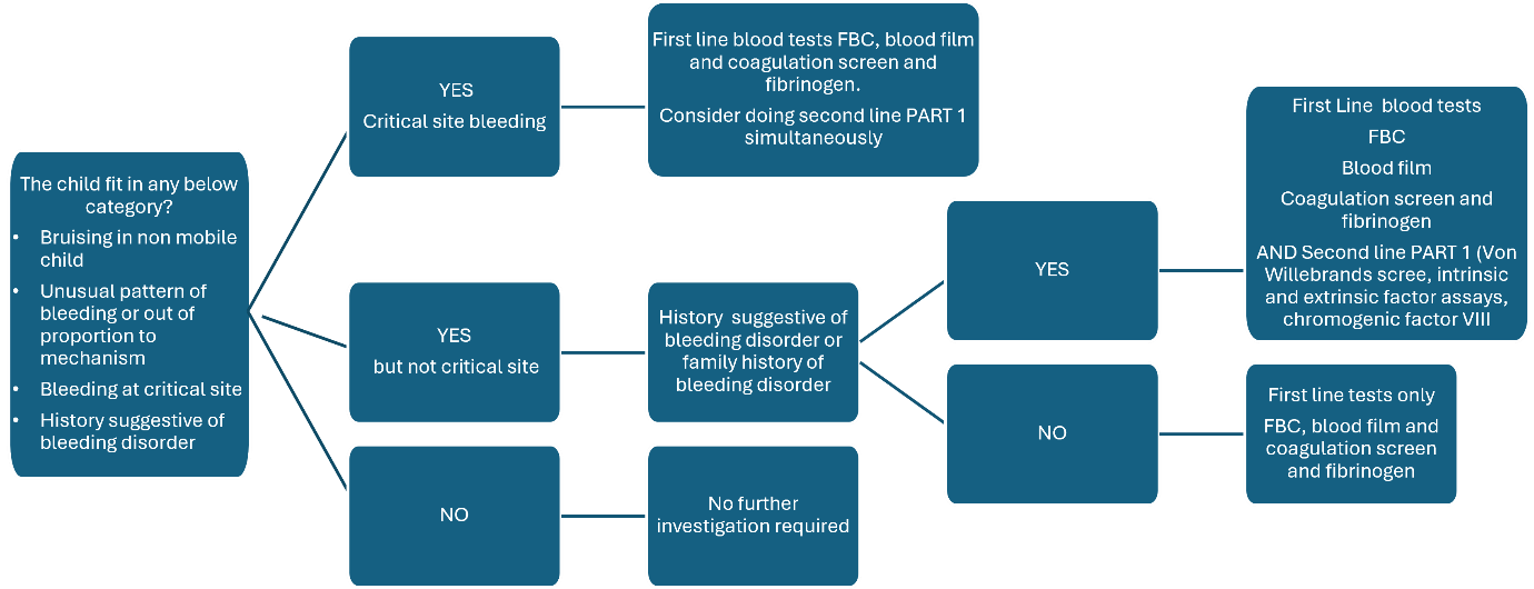 Second line part two investigations should only be done after discussion with paediatric haematology. This can be with the registrar who would be expected to discuss all child protection cases with the on-call consultant. In cases of high suspicion of a bleeding disorder, it may be appropriate to do all second line tests simultaneously with first line tests after discussion with a haematologist, to avoid multiple sampling attempts. Dect phone at RHC is 85645 for the non-malignant haematology registrar.