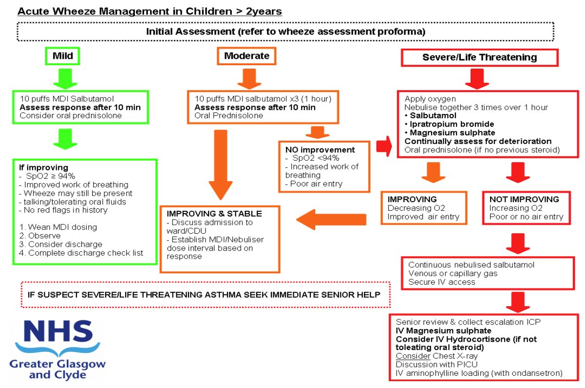 Any child requiring intravenous therapy for wheeze. Patients who have required intravenous therapy for wheeze should be monitored in hospital for at least 24 hours post the discontinuation of all intravenous therapy. Any child where there is a concern that they have failed to respond to significant asthma treatment. ALL RESPIRATORY REFERRALS SHOULD BE DISCUSSED WITH RESPIRATORY TEAM PRIOR TO PATIENT DISCHARGE FROM HOSPITAL. |