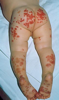 - Classical symmetrical distribution of palpable purpura - predominantly over the child’s buttocks, lower limbs and ankles