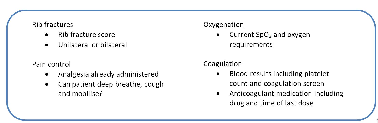 This guideline provides a framework for pain management for patients sustaining rib fractures whether sustained as a result of polytrauma or as a single injury. It acts as a reference for all parties involved in the care of these patients at Raigmore. It includes clinical strategies to reduce morbidity, including multimodal pain management, catheter-based analgesia, pulmonary hygiene, and discusses referral for operative stabilization.