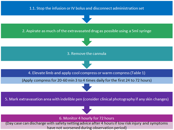 The initial management algorithm below summaries the initial actions that should occur once extravasation is detected or suspected to minimise ensuing tissue injury.