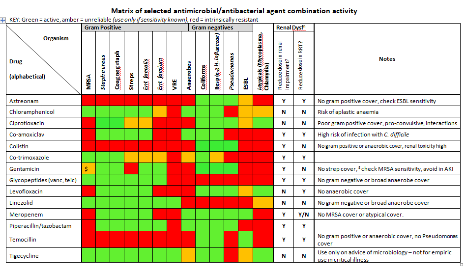 | Sepsis of unknown focus | Aztreonam 2 grams every 8 hours (as NHS Tayside), can increase to 6 hourly dosing if required PLUS metronidazole 500mg x 3 PLUS vancomycin (covers MRSA) | If strong suspicion of group A Strep or Staph Toxic Shock Syndrome, discuss with microbiology and consider adding clindamycin and using immunoglobulin. |