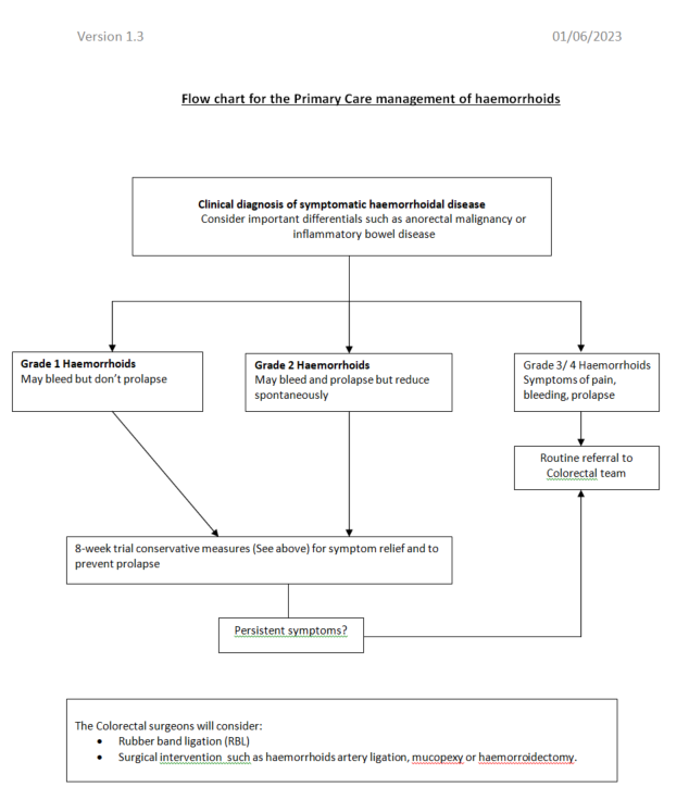The majority of haemorrhoids are grade 1 and 2 on the Goligher classification system. According to the European Society of Coloproctologists (ESCP) and the American Society of Colorectal Surgeons (ASCRS) guidelines, conservative measures in primary care are the mainstay of treatment and are aimed at symptom relief and prevention of haemorrhoidal prolapse.