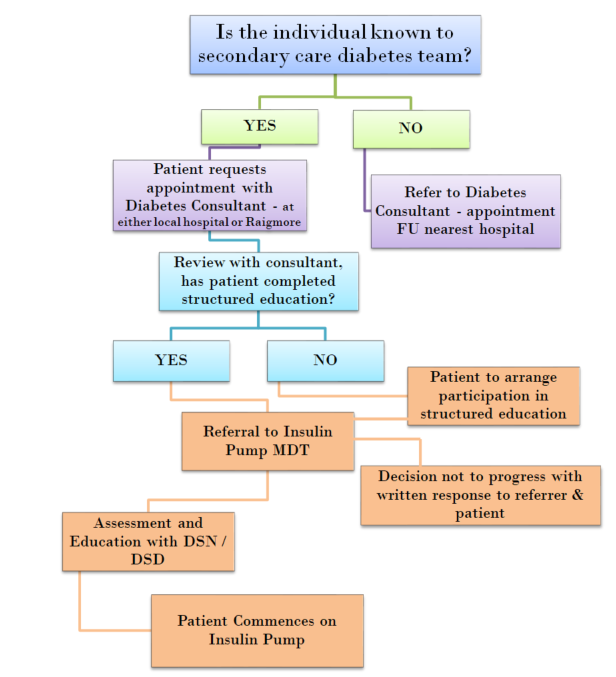 Referrals to the pump service should be made by healthcare professionals with diabetes specialist skills, after the patient has completed appropriate structured education and is using an intensive multi-dose insulin regimen therapy, to the best of the their ability. Individuals may also refer themselves if they feel they meet criteria or would like clarification on requirements to obtain an insulin pump. Please see appendix 1