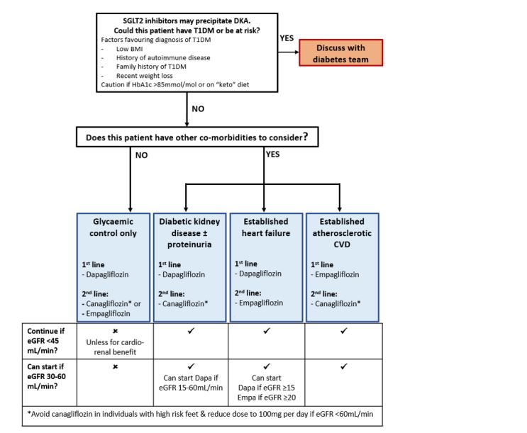 Some agents have licenses for specific indications. The following flow chart demonstrates some of the factors to consider when considering initiation of an SGLT2 inhibitor.