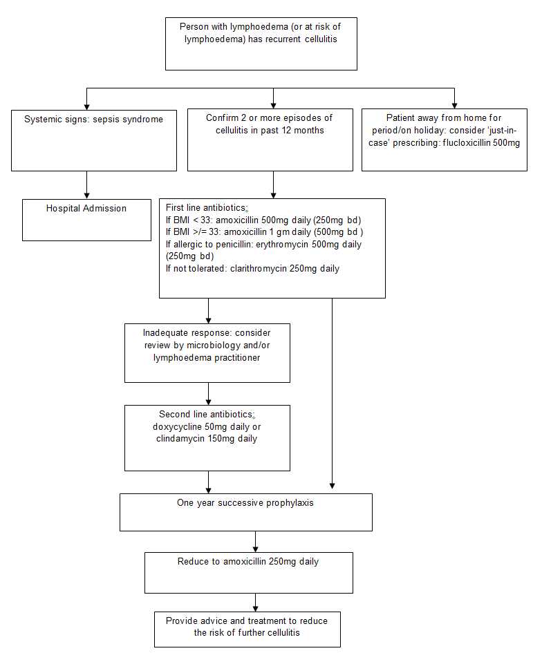 - Effective use of decongestive and compression therapy is essential in managing oedema, ulceration and skin problems that may lead to recurrent cellulitis: consider referral to lymphoedema practitioner.