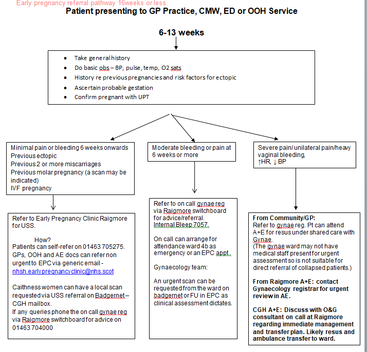 Patients can self-refer to the Early Pregnancy Assessment Unit which provides a service 0830- 1530 on Monday, Tuesday, Thursday and Friday (closed on Wednesday). The phone number is 01463 705275 and if there is no answer or out of hours a message can be left on the answer machine and will be responded to within working hours.