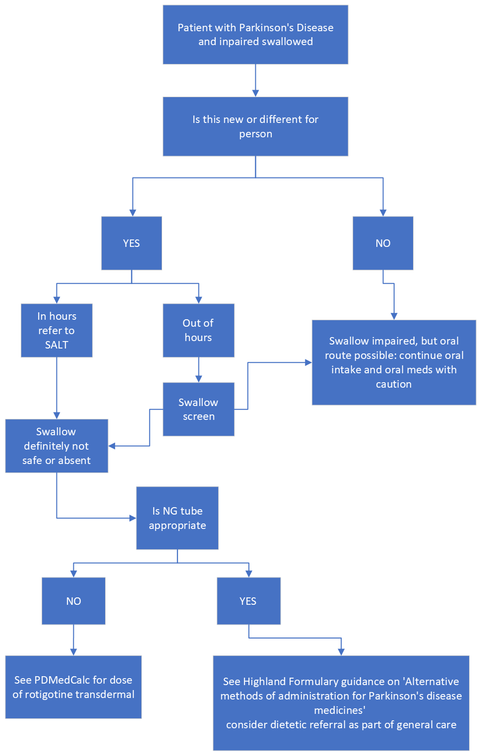 - A clinician with expertise in PD should be involved in drug treatment decisions on the initiation and ongoing monitoring of therapy as the disease progresses. Drugs used in the treatment of PD are detailed in the Highland Formulary.