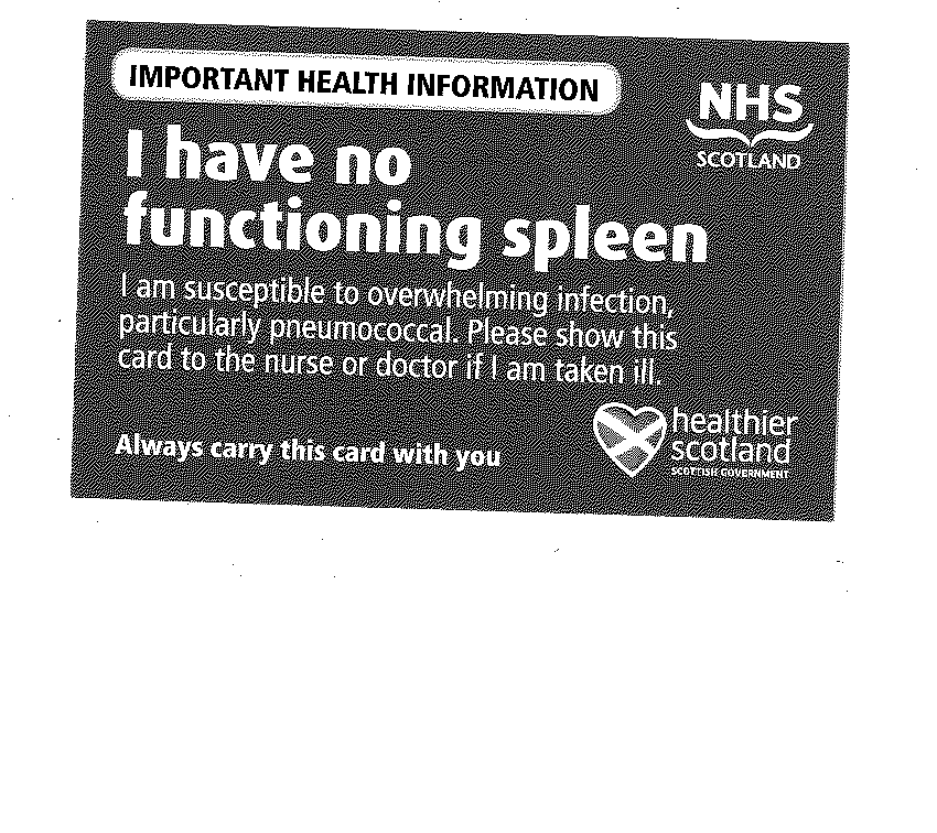 All patients identified as described above will be sent a leaflet, A guide for people without a working spleen which includes an alert card (Appendix 2) to be carried in a purse/wallet.