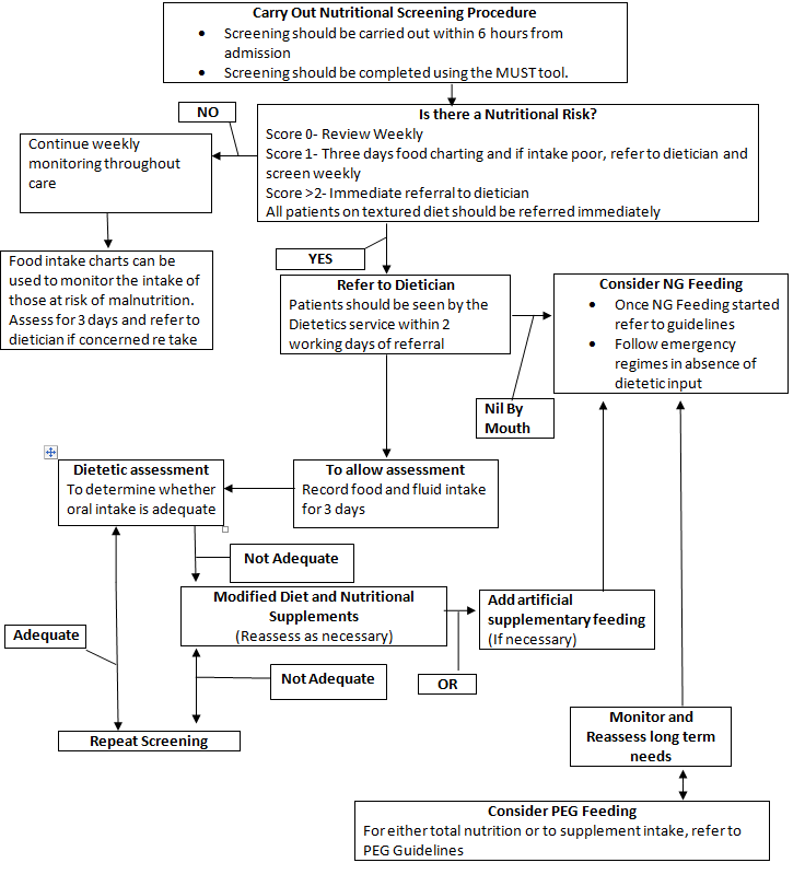When a stroke patient is admitted to hospital, screening for risk of under nutrition should be completed within 6 hours using the Malnutrition Universal Screening Tool (MUST) developed by the Malnutrition Advisory Group Available on: www.bapen.org.ukand click on ‘MUST’