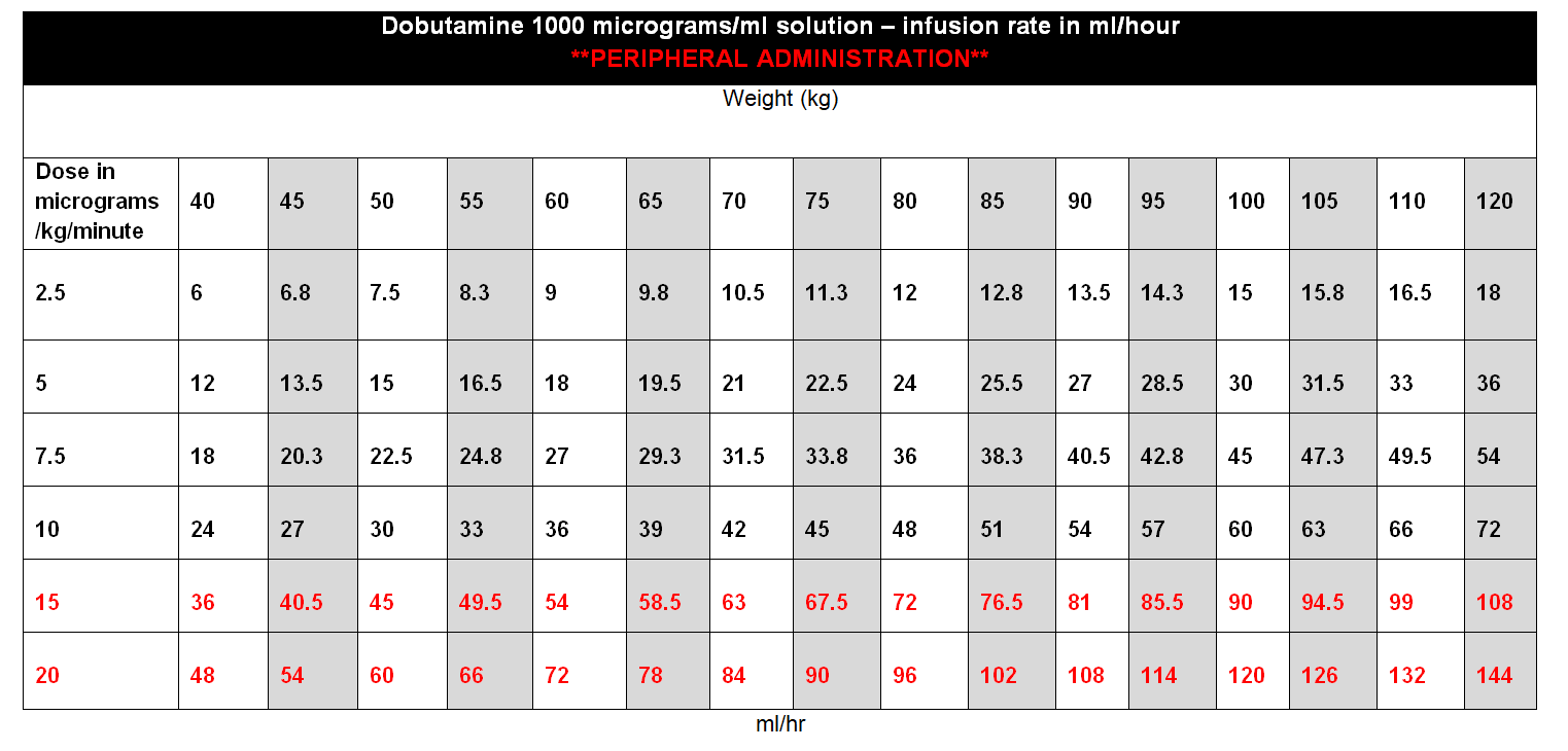 - Withdraw equivalent volume from a 250mL bag of glucose 5% or sodium chloride 0.9% (20mL if using 250mg in 20mL, or 50mL if using 250mg in 50mL) and add the 250mg dobutamine to prepare a 1000 micrograms in 1mL solution and administer via a volumetric pump.