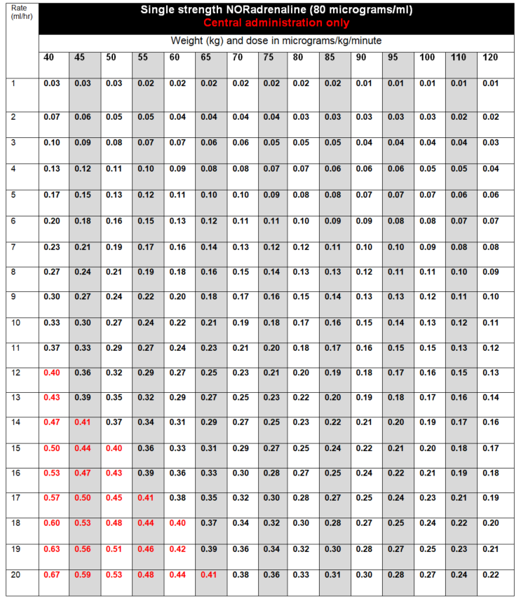 - If ready-to-use preparations unavailable, or preparing quad strength noradrenaline (16mg in 50mL, 320 micrograms/mL), dilute required volume of noradrenaline with glucose 5% to total volume and administer via syringe pump or volumetric infusion.