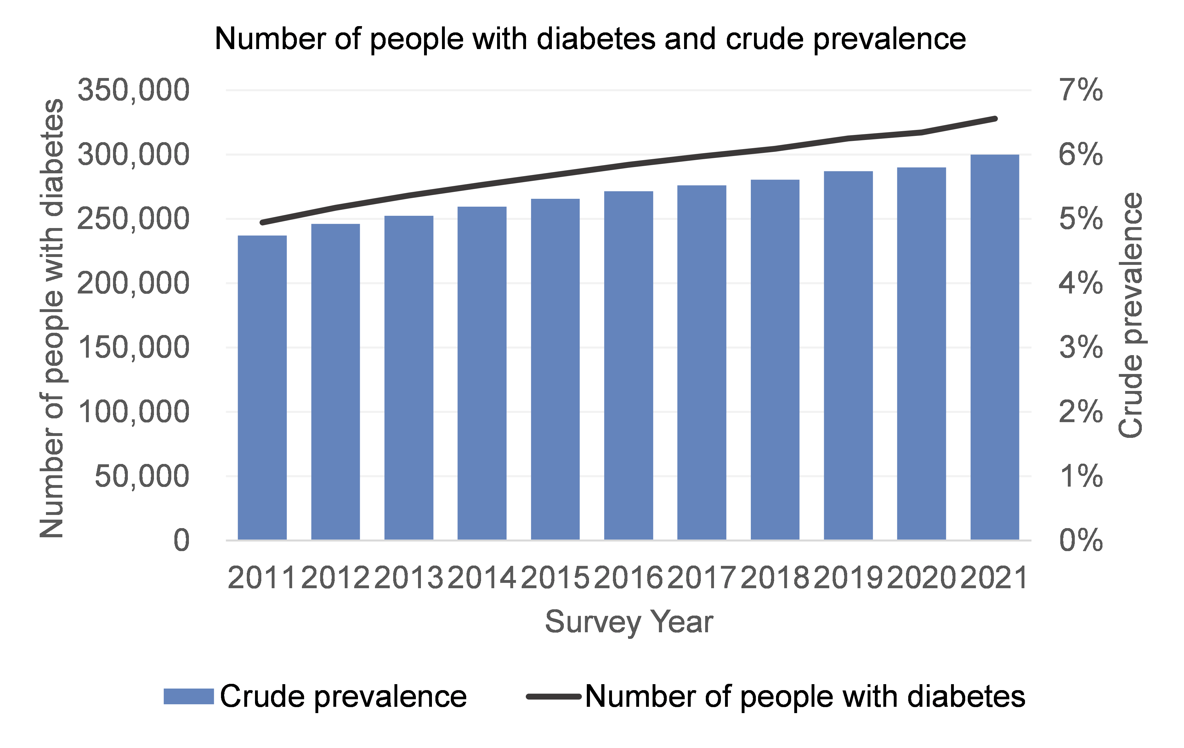 At the end of 2020 there were 327,927 people with known diabetes in Scotland recorded on Scottish Care Information-Diabetes (SCI-Diabetes), which represents a crude prevalence of 6.0% of the population of all ages (5,463,300). The full report is available here10