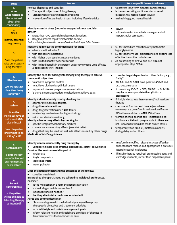 A polypharmacy review (following the 7-Steps approach) should ensure optimal management of T2DM and other conditions. It should include addressing aggravating lifestyle factors and consideration of the most appropriate medication at the right dose with regular review.